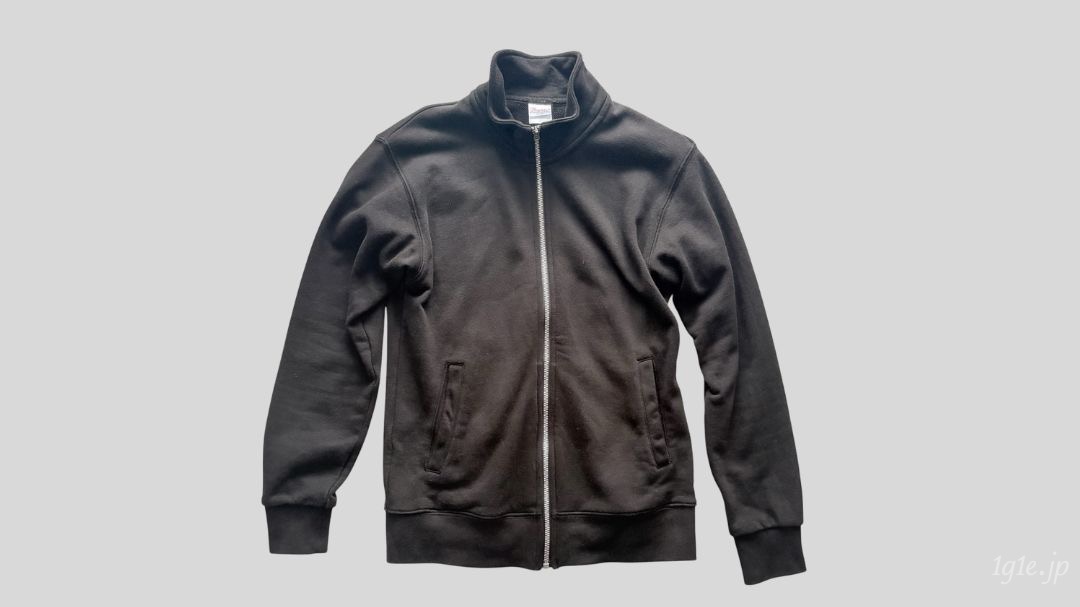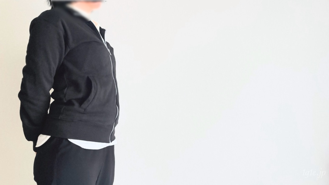 フードなしパーカーを着てたこともあるんだけど、着膨れ感がひどかったので、あくまで「ジャケット」にこだわりつつ、ラフなスウェットジャケットを使っています。