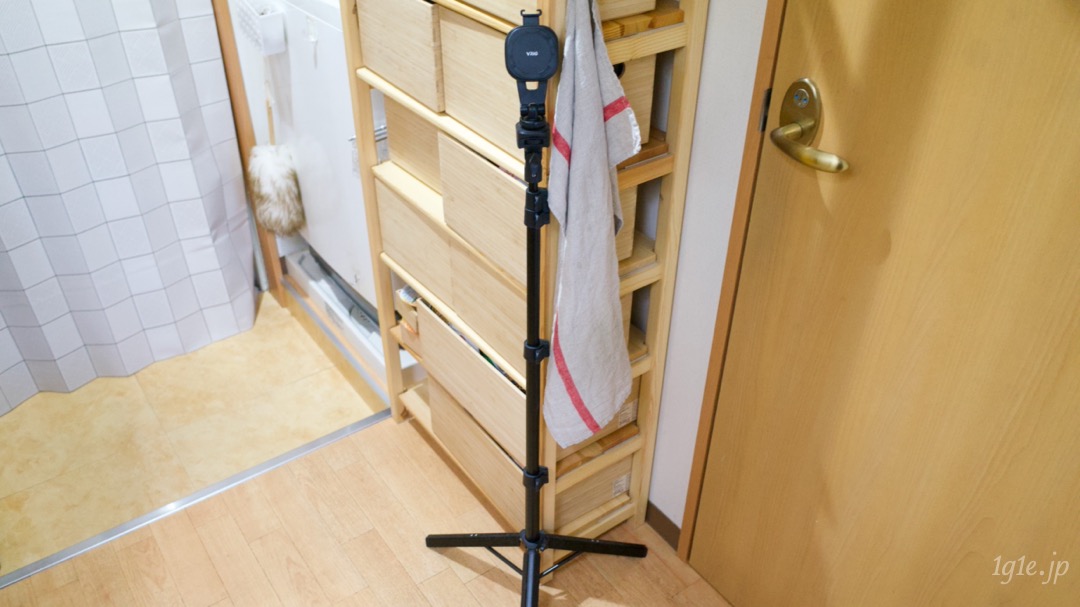 それがめんどうで、「脚を展開した状態で、視界のジャマにならない場所ないかなぁ・・・」と悩んでたところ、キッチン棚の端に置くのがちょうどよかった!