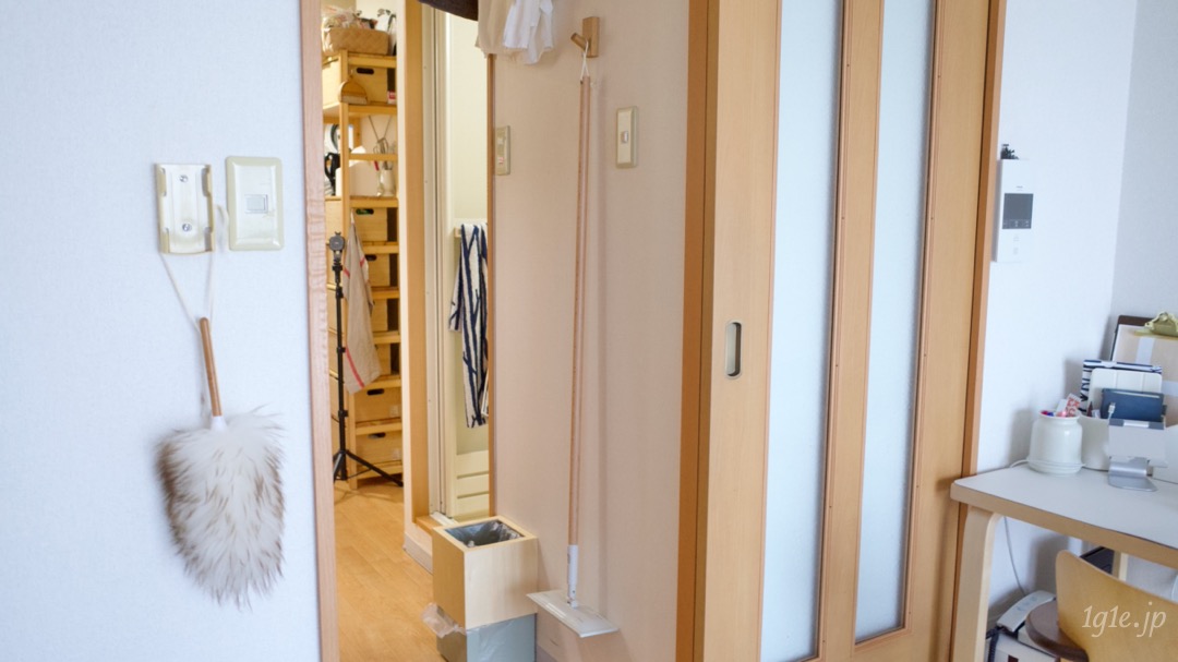 通路の壁にフローリングワイパーを吊るして収納しています。