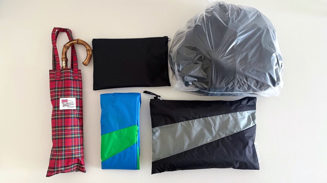 他には、メガネ・スマホ充電用ケーブル&アダプター、サブのエコバッグを入れてます。
