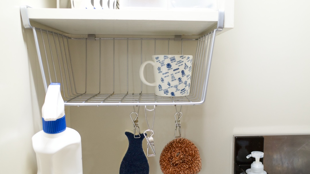 一部は備え付け棚以外に収納してて、うがい用マグカップは備え付け棚すぐ下に吊るしてるラックが定位置。