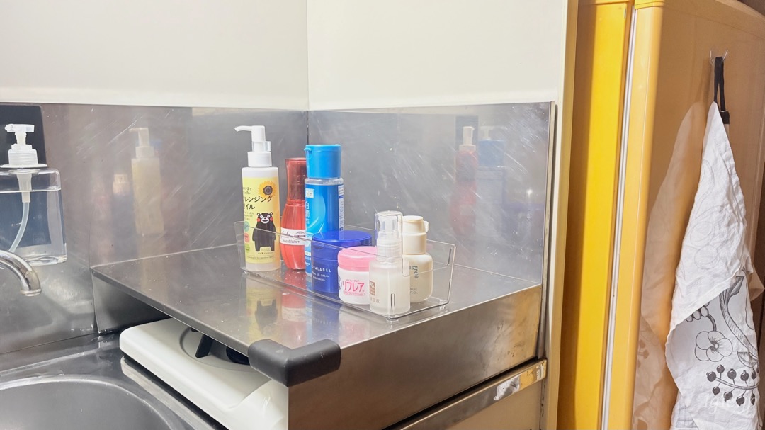 キッチンにはキッチンアイテムがぎっしり収納されてて、スキンケア用品を収納する余裕がありません。