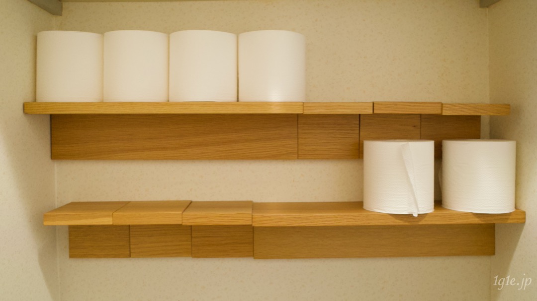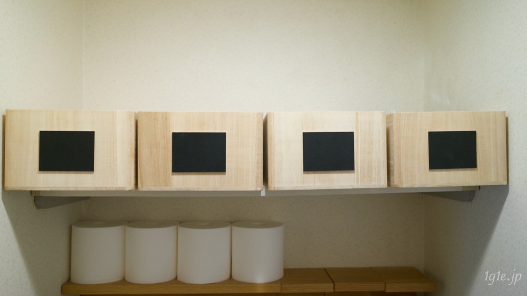 トイレの備え付け棚にはOUR HOMEの「桐のはこ。」4個を並べています。