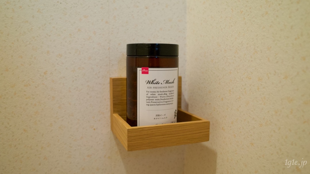 無印良品の「壁に付けられる家具・トレー」を設置し、そこにダイソーの消臭剤を置いています。