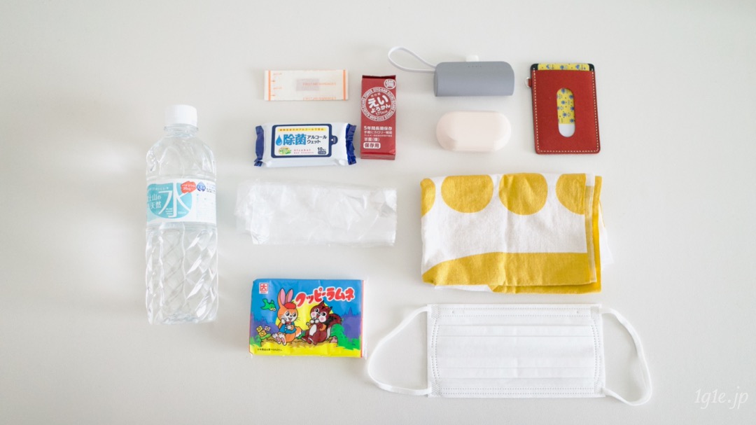 ようかん、モバイルバッテリー、絆創膏は近所をウォーキングするくらいなら本当は必要ないんだけど、防災グッズとして持ち歩いてます。